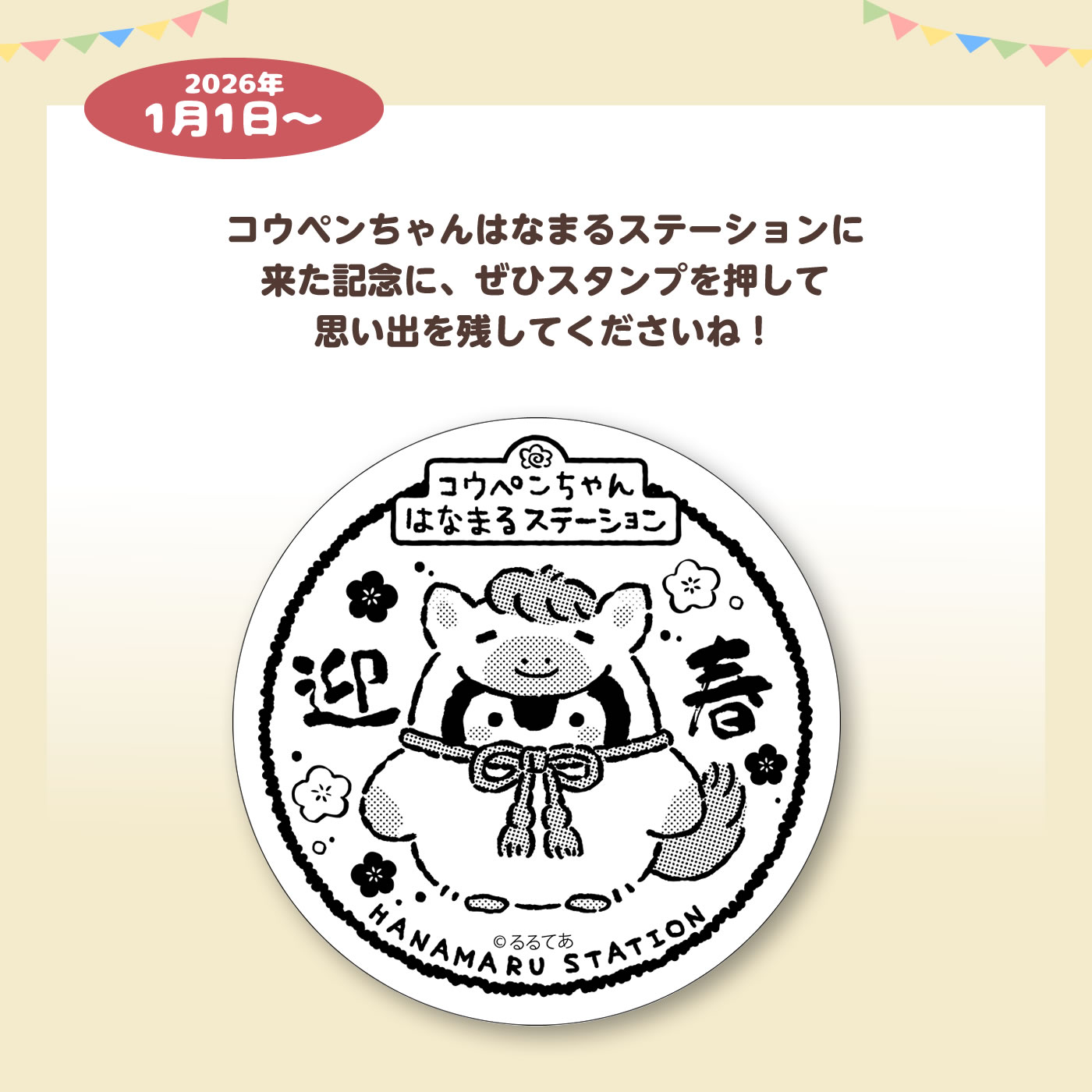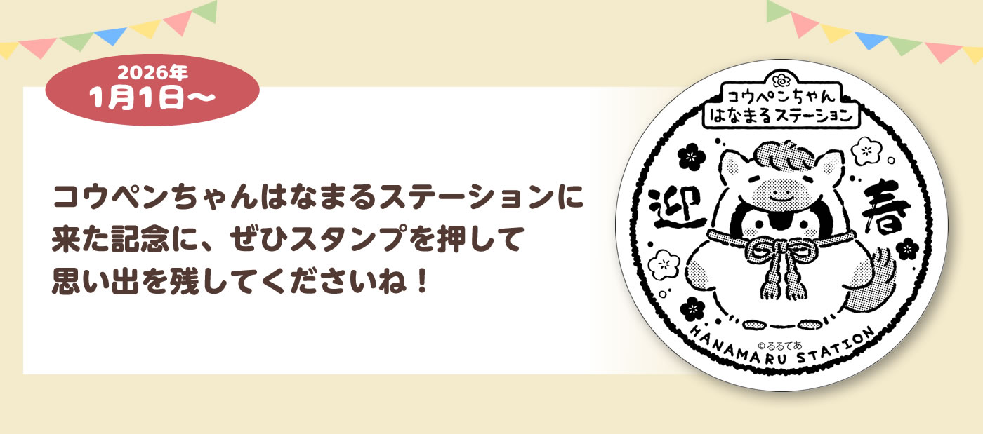 コウペンちゃんはなまるステーションに来た記念に、ぜひスタンプを押して思い出を残してくださいね!