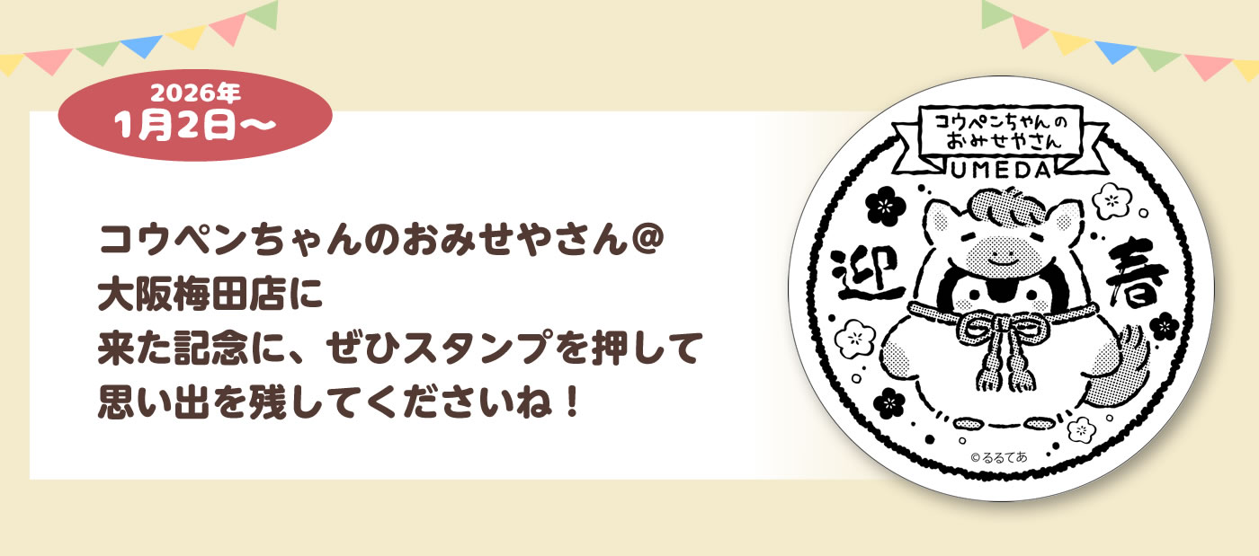 「コウペンちゃんのおみせやさん@大阪梅田店」にて、商品をお買い上げのお客様にノベルティをプレゼントいたします!